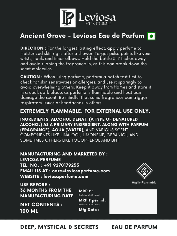 When using perfume, perform a patch test first to check for skin sensitivities or allergies, and use it sparingly to avoid overwhelming others. Keep it away from flames and store it in a cool, dark place, as perfume is flammable and heat can damage the scent. Be mindful that some fragrances can trigger respiratory issues or headaches in others. EXTREMELY FLAMMABLE. FOR EXTERNAL USE ONLY.INGREDIENTS