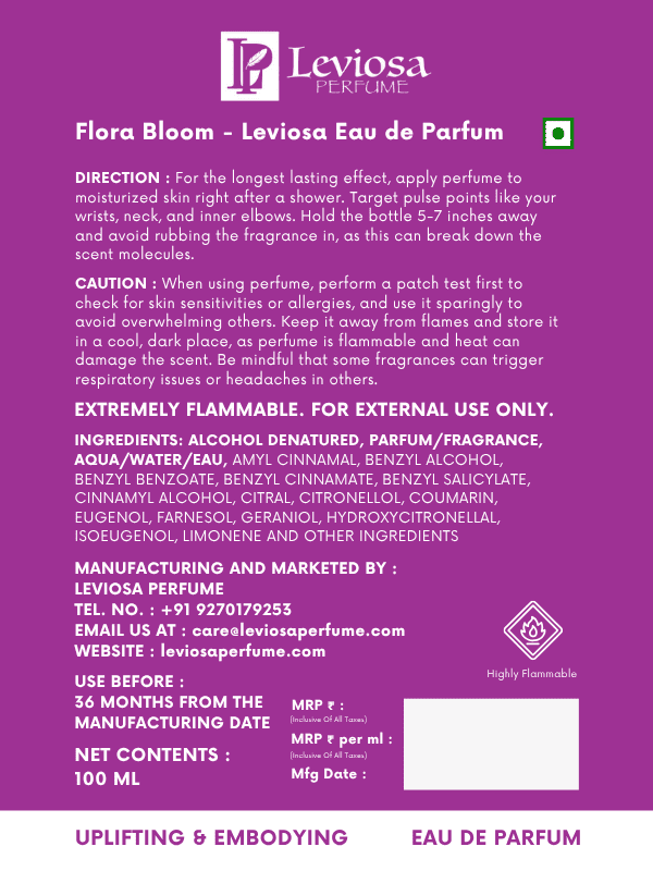 Alcohol Denatured, Parfum/Fragrance, Aqua/Water/Eau, Amyl Cinnamal, Benzyl Alcohol, Benzyl Benzoate, Benzyl Cinnamate, Benzyl Salicylate, Cinnamyl Alcohol, Citral, Citronellol, Coumarin, Eugenol, Farnesol, Geraniol, Hydroxycitronellal, Isoeugenol, Limonene and other ingredients.About Leviosa Perfumes