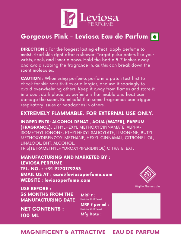 When using perfume, perform a patch test first to check for skin sensitivities or allergies, and use it sparingly to avoid overwhelming others. Keep it away from flames and store it in a cool, dark place, as perfume is flammable and heat can damage the scent. Be mindful that some fragrances can trigger respiratory issues or headaches in others. EXTREMELY FLAMMABLE. FOR EXTERNAL USE ONLY.INGREDIENTS