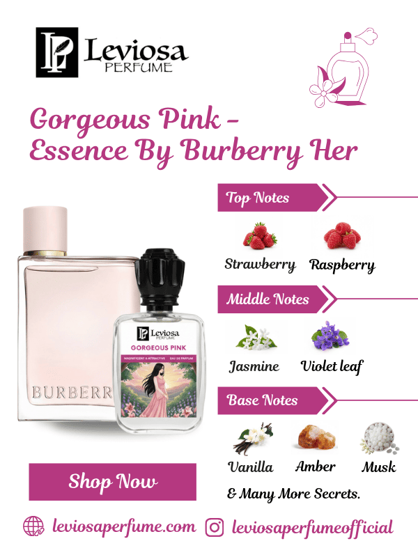 Gorgeous Pink is a playful, vibrant fruity gourmand fragrance bursting with sweet strawberry and blackcurrant notes, complemented by delicate jasmine and violet florals, resting on a cozy base of vanilla and amber. Inspired by B*rberry Her. Worn by Kare*na Kapo*r.