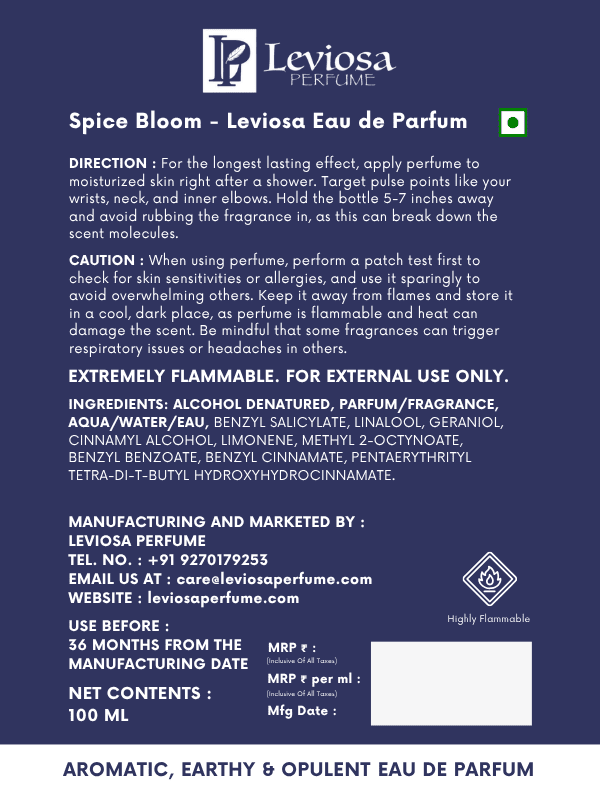When using perfume, perform a patch test first to check for skin sensitivities or allergies, and use it sparingly to avoid overwhelming others. Keep it away from flames and store it in a cool, dark place, as perfume is flammable and heat can damage the scent. Be mindful that some fragrances can trigger respiratory issues or headaches in others. EXTREMELY FLAMMABLE. FOR EXTERNAL USE ONLY.INGREDIENTS