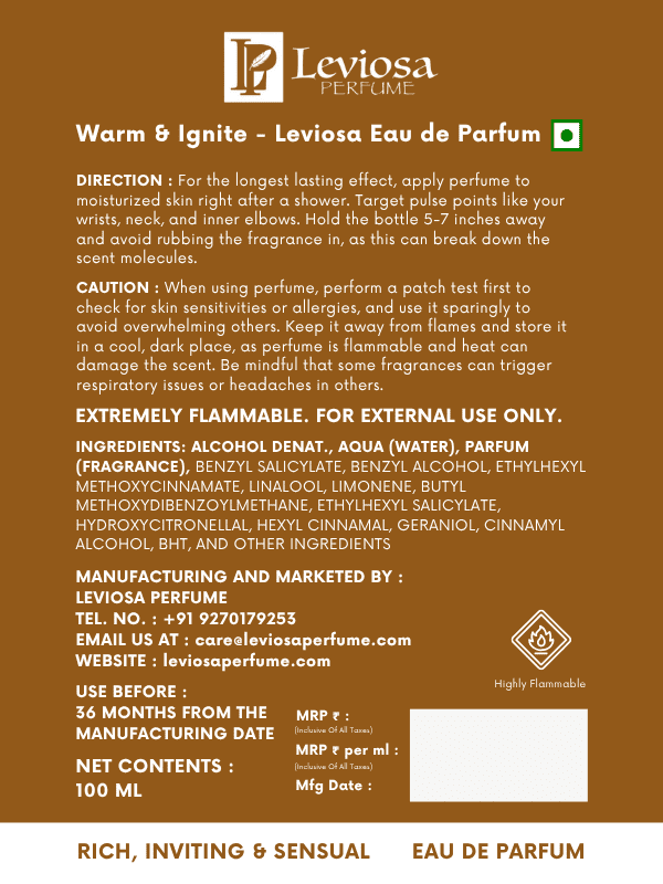 Warm & Ignite is a captivating floral-fruity scent opening with sparkling pear and black currant, blooming into a passionate heart of rose and jasmine, and settling into a warm, creamy base of vanilla and cedarwood. Inspired by Arm*ni Passion. Worn by Sh*hid K*poor.