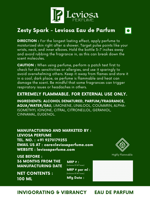 When using perfume, perform a patch test first to check for skin sensitivities or allergies, and use it sparingly to avoid overwhelming others. Keep it away from flames and store it in a cool, dark place, as perfume is flammable and heat can damage the scent. Be mindful that some fragrances can trigger respiratory issues or headaches in others. EXTREMELY FLAMMABLE. FOR EXTERNAL USE ONLY.INGREDIENTS